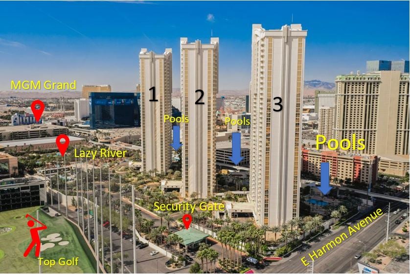 MGM Signature is a prominent high-rise luxury condominium-hotel complex in Las Vegas, known for offering a unique blend of residential and hotel living. Built as a joint venture between Turnberry Partners and MGM, these three 38-story guard-gated towers are consistently in high demand. MGM Signature consists of three identical towers, each standing 38 stories tall and comprising 1728 fully furnished units. The complex is situated just off the Las Vegas Strip, providing residents with convenient access to the city’s vibrant heart while offering a more secluded and exclusive environment. The towers offer a variety of unit types, including studio, one-bedroom, and two-bedroom suites, each elegantly furnished and equipped with modern amenities. Residents enjoy hotel-like services such as 24-hour concierge, valet parking, and housekeeping. The complex boasts multiple outdoor pools, hot tubs, and a state-of-the-art fitness center. Residents have access to numerous dining options, both within the towers and at the adjacent MGM Grand, including fine dining, casual eateries, and vibrant nightlife venues. The MGM Grand Spa offers a wide range of wellness and beauty treatments.